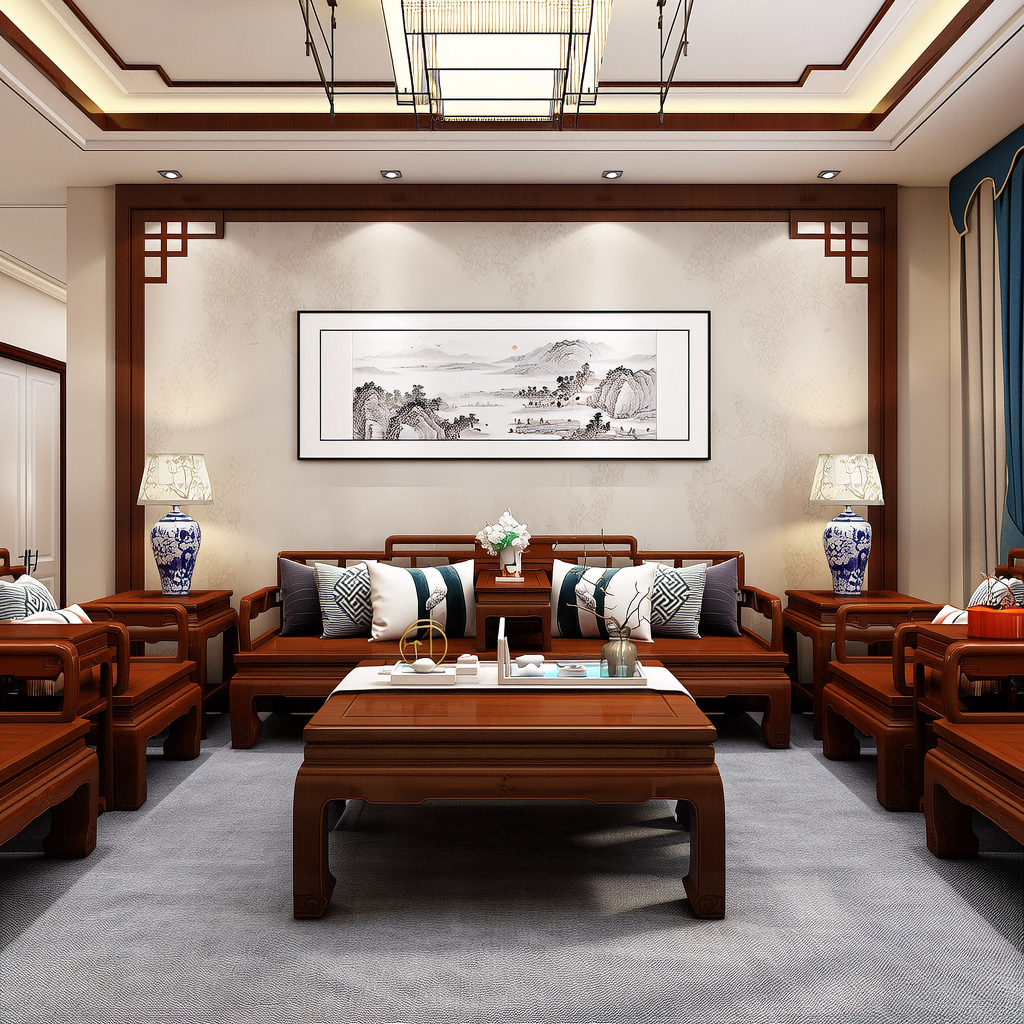 - 家具造型融合了中式传统与现代元素,体现新中式风格。
