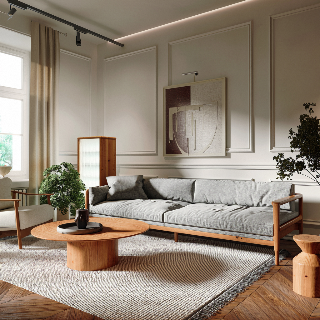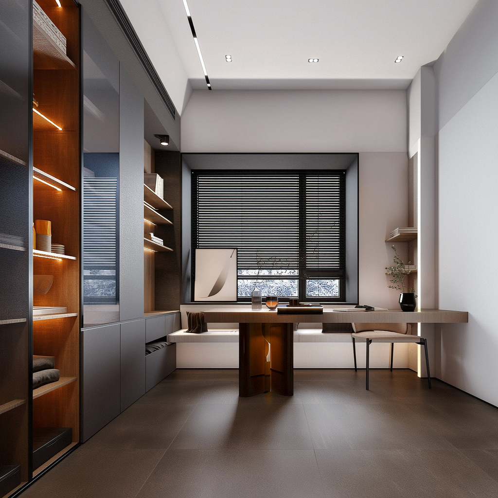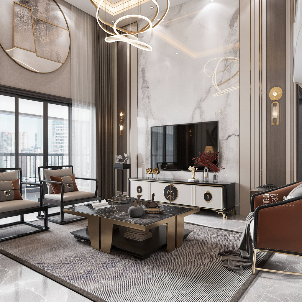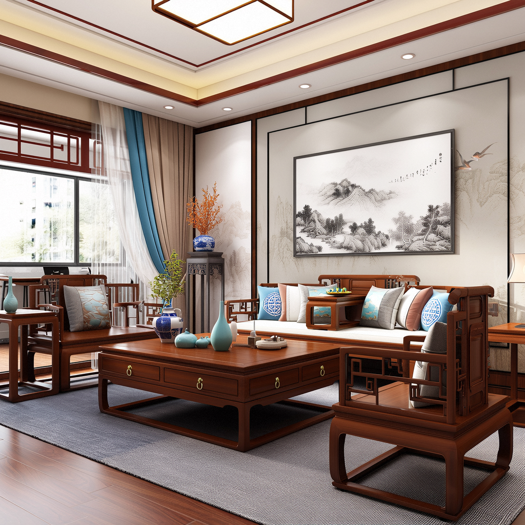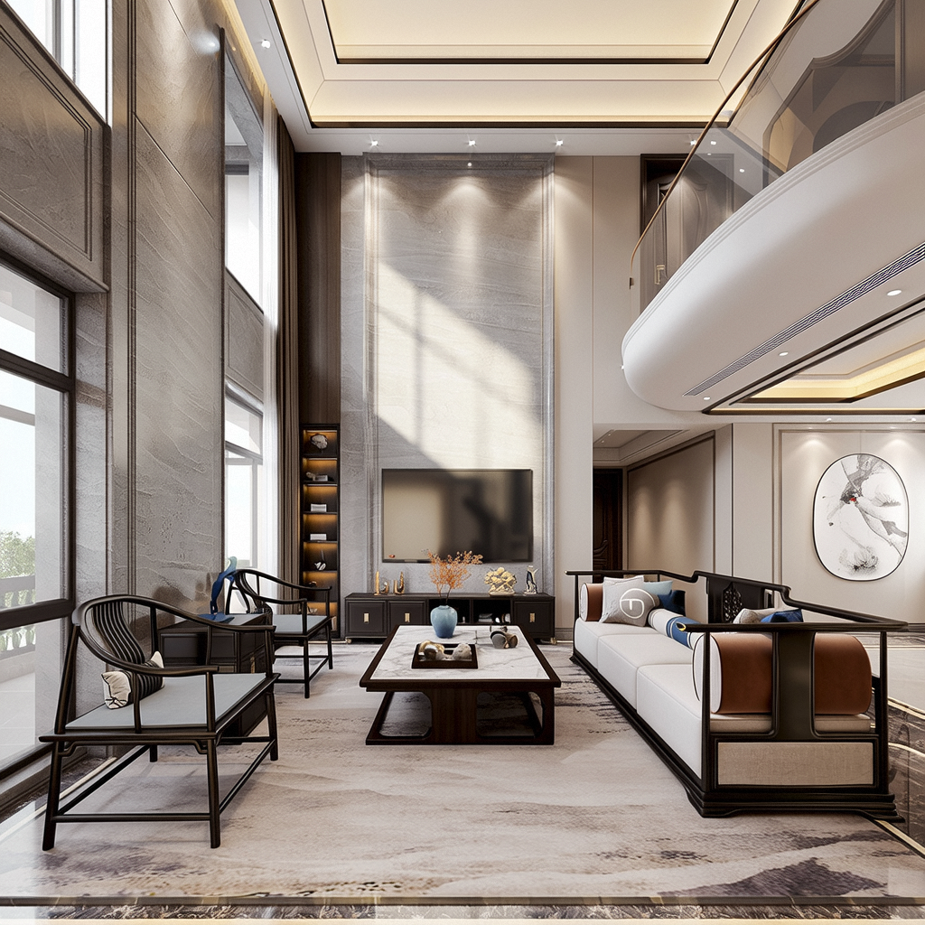 - 家具造型融合了中式传统与现代元素,体现新中式风格。