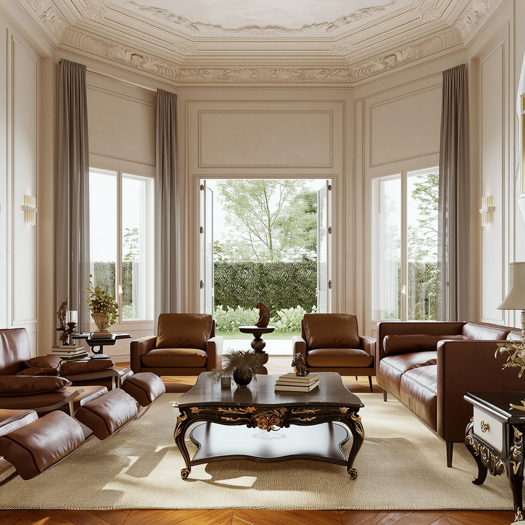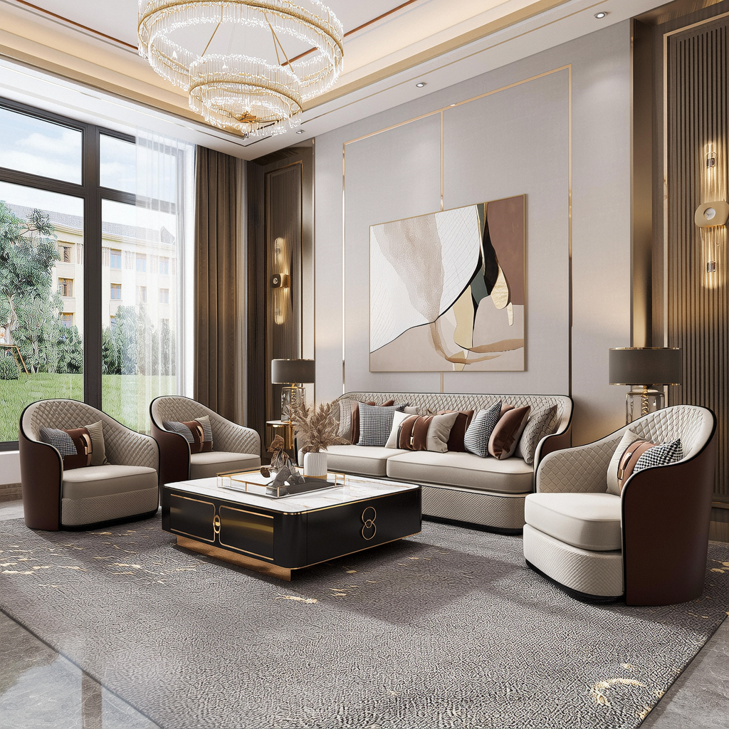- 大量使用天然材质,如实木、大理石、皮革等。