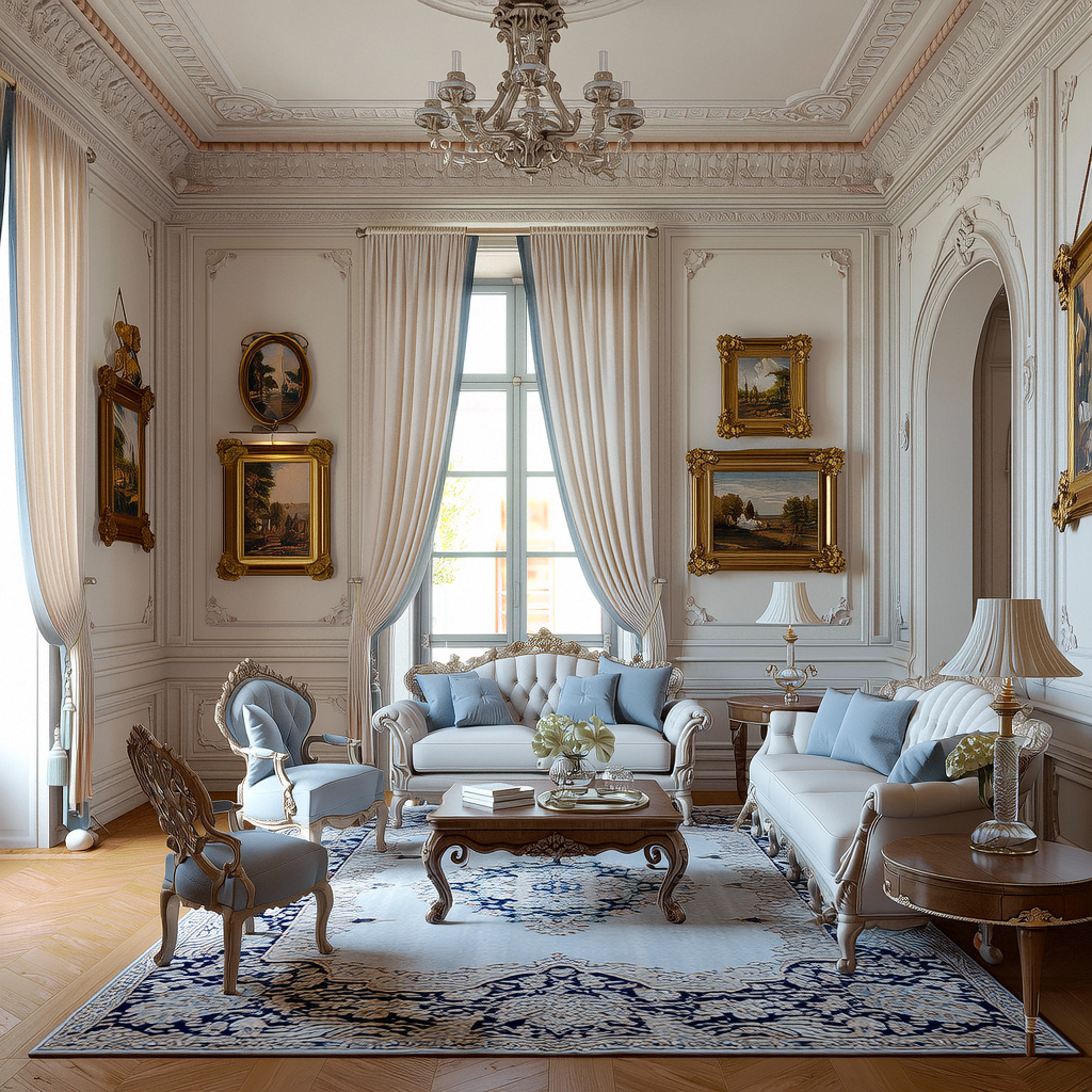 - 大量使用欧式复古元素,如水晶吊灯、古典挂画、雕花镜框等。